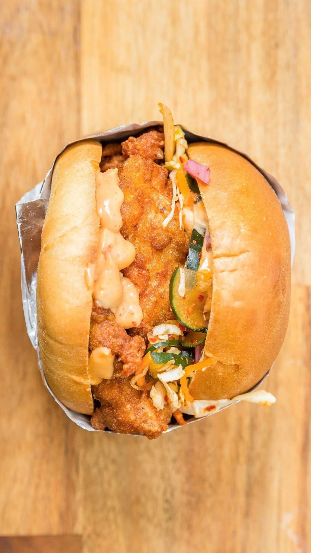 Juicy fried or Korean-glazed chicken on fresh buns, topped with crisp veggies and bold sauces. A satisfying meal for takeout, delivery, or catering.