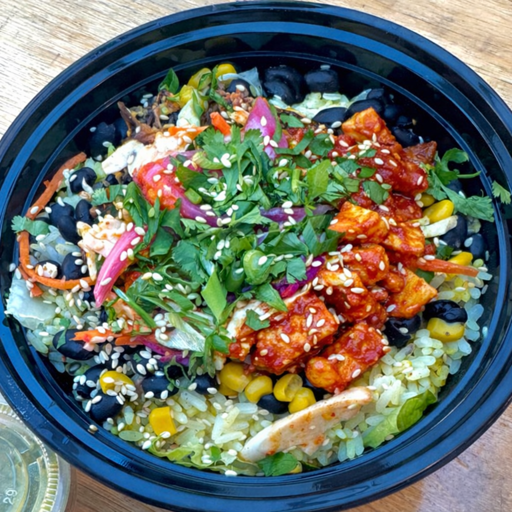 A fresh bowl with sesame rice and/or chopped romaine, black beans, corn, pico de gallo and house toppings. Choose al pastor tofu or other vegan-friendly ingredients to build your bowl.